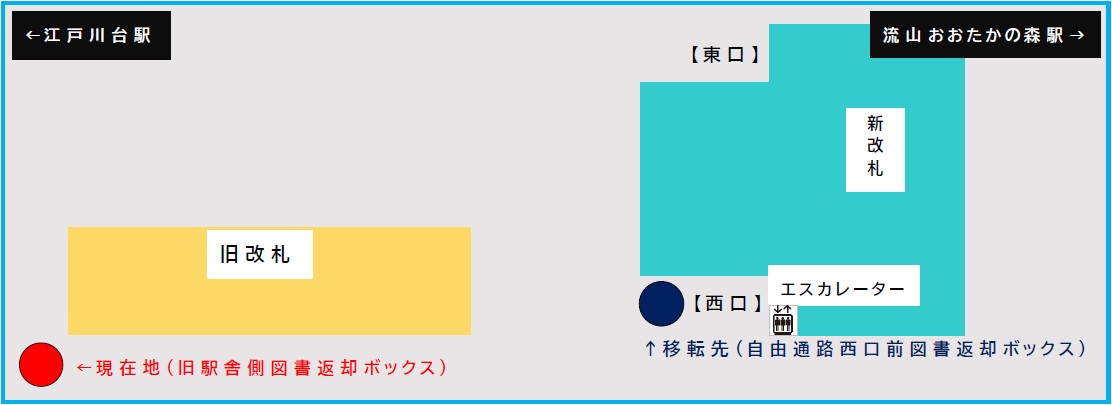 初石駅の図書返却ボックスは、12月21日(日)9時から、新たに整備される自由通路西口前へ移設します。移設後は、旧駅舎側の図書返却ボックスは利用できなくなりますのでご注意ください。