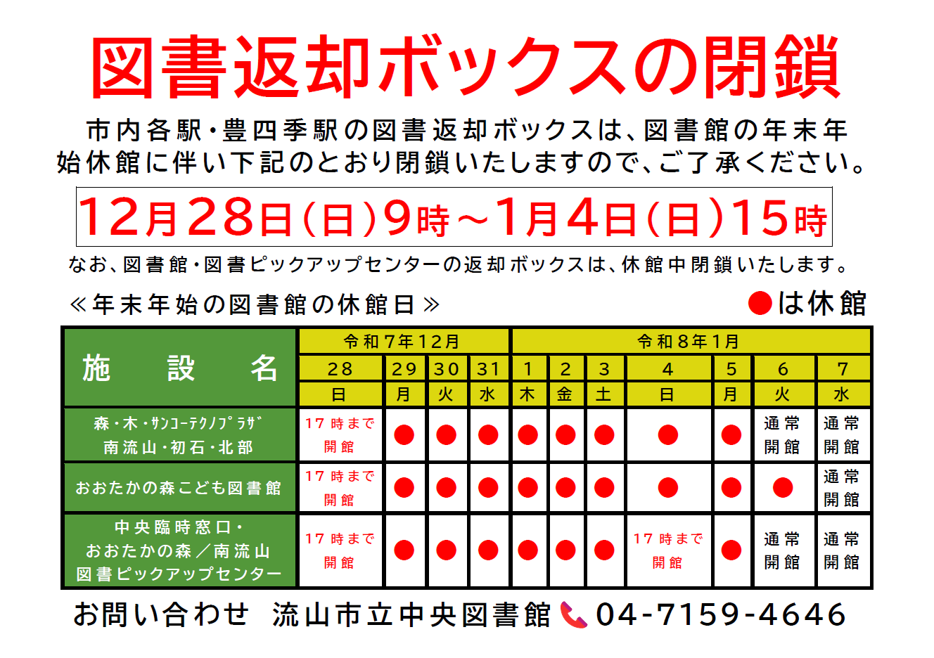 市内各図書館・図書ピックアップセンターの図書返却ボックスは、年末年始の休館中、閉鎖いたします。市内各駅・豊四季駅の図書返却ボックスは、令和7年12月28日(日)9時から令和8年1月4日(日)15時まで閉鎖いたします。